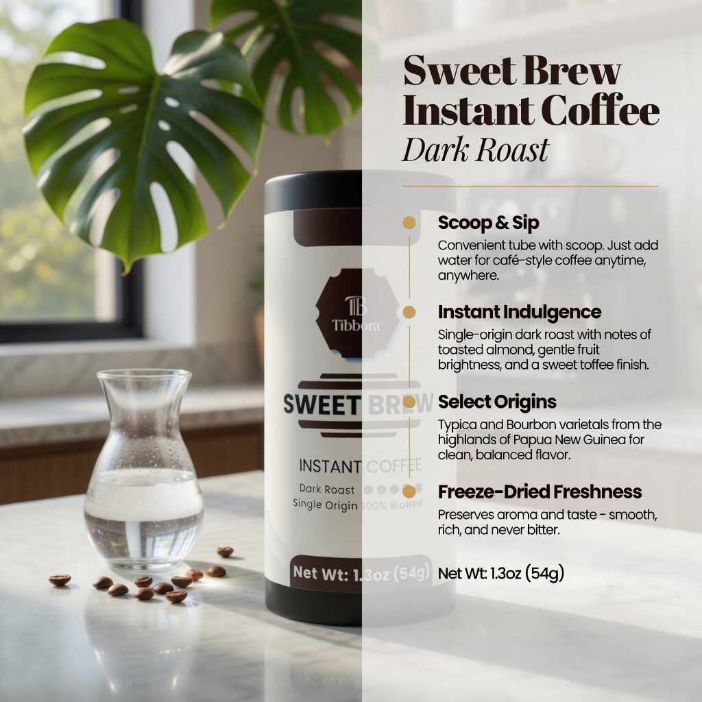 Experience premium coffee in seconds with Sweet Brew Instant Coffee, a high-quality single-origin instant coffee crafted from Arabica beans grown in the highlands of Papua New Guinea. This expertly roasted dark blend delivers a rich and satisfying cup with toasted almond depth, subtle fruit brightness, and a smooth toffee finish.